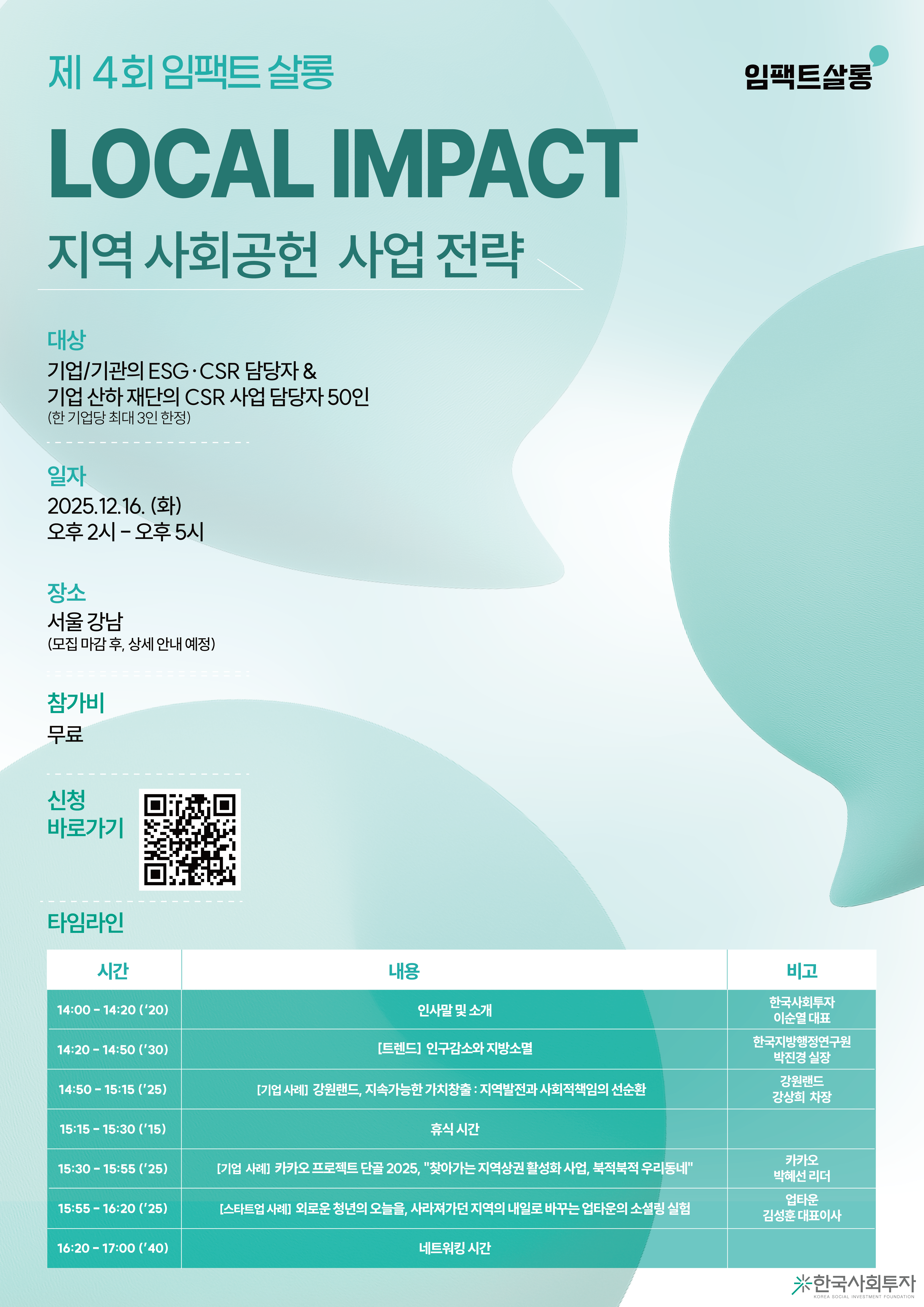 이번 주제는 [로컬 임팩트 : 지역 사회공헌 사업 전략]으로, 지역 소멸, 불균형, 소상공인 상생 등 지역에서 발생하는 다양한 사회문제 해결 사례를 공유하고, 기업 간 협력 가능성을 모색하는 네트워킹 자리를 마련하였습니다. 많은 관심 부탁드립니다 :)