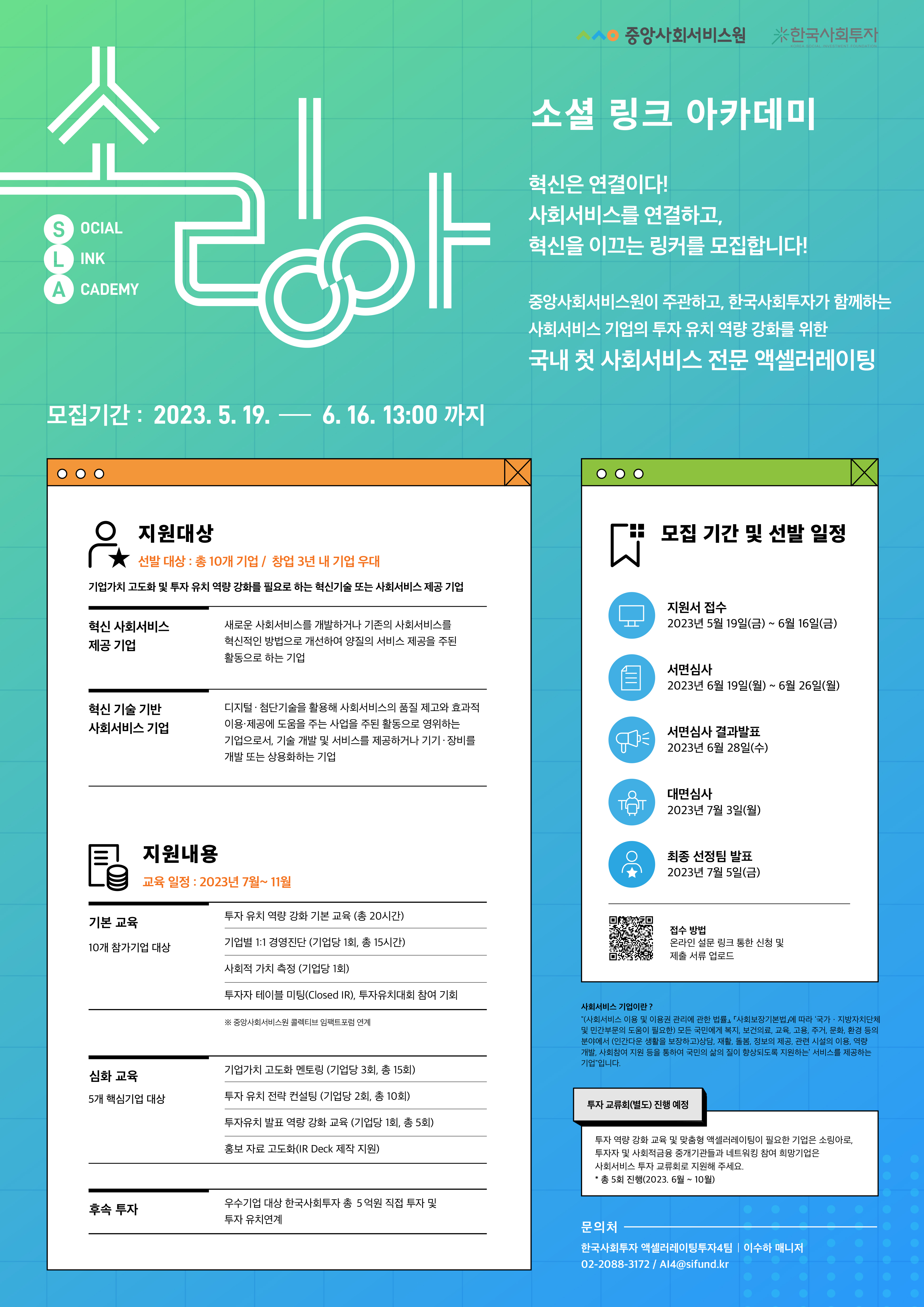 중앙사회서비스원이 주관하고, 한국사회투자가 함께하는 국내 첫 사회서비스 전문 액셀러레이팅 프로그램 '소링아(소셜 링크 아카데미, SLA)가 사회서비스를 연결하고 혁신을 이끄는 링커(사회서비스 기업) 여러분의 신청을 기다립니다.